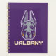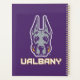Le logo de la mascotte de l'Université d'Albany Great Dane présente une représentation stylisée de la tête d'un grand Danois. Le chien est illustré de lignes vives et audacieuses en violet et gris, lui donnant une expression féroce et confiante. Les oreilles sont hautes, symbolisant la vigilance et la force. Sous la tête du Grand Danois se trouve le mot "UAlbany" écrit en caractères d'or gras et bloquants, surligné de violet, renforçant l'image de marque de l'université. Cette conception représente les équipes sportives d'UAlbany, mettant en avant le pouvoir, la loyauté et la détermination.