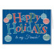 Une carte Happy Holidays pour un Fiancé, avec des ornements et des lettres, remplie de chevrons et de pois rouges, bleus et verts, encadrée en blanc sur un arrière - plan bleu vif. Il y a aussi une carte frontale personnalisée avec ce design en coque que vous ne pouvez pas trouver de carte pour le destinataire spécifique que vous cherchez.