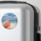 Aimant photo souvenir rond avec les pieds des femmes avec vernis à ongles rose rouge sur une plage blanche sur une île dans la mer méditerranée en se relaxant pendant les vacances d'été.
