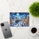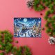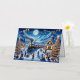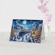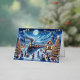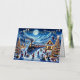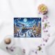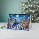 Une belle aquarelle d'une scène hivernale nocturne avec une locomotive à vapeur vintage arrivant à une station ornée de lumières festives de Noël. La neige recouvre le sol et les toits, et la toile de fond présente des montagnes imposantes sous un ciel étoilé avec une pleine lune. La lumière chaleureuse des phares du train et les lumières scintillantes créent une atmosphère de vacances accueillante et confortable, évoquant des sentiments de nostalgie et de célébration associés à la période de Noël.