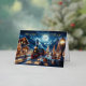 Une belle aquarelle d'une scène hivernale nocturne avec une locomotive à vapeur vintage arrivant à une station ornée de lumières festives de Noël. La neige recouvre le sol et les toits, et la toile de fond présente des montagnes imposantes sous un ciel étoilé avec une pleine lune. La lumière chaleureuse des phares du train et les lumières scintillantes créent une atmosphère de vacances accueillante et confortable, évoquant des sentiments de nostalgie et de célébration associés à la période de Noël.