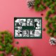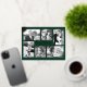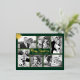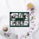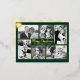 Cartes postales de Noël en feuille d'or avec six modèles photo. Les cadres et le texte sont en feuille, tout comme le flocon de neige dans le coin supérieur. L'or est montré, avec deux autres couleurs à choisir. Ajoutez des photos de la famille et des animaux de compagnie en orientation horizontale, verticale et carré. Votre photo remplira chaque modèle. Les images entourent le texte central. Ajoutez un message de bienvenue et une signature préférés. La couleur arrière - plan vert foncé de la forêt fonctionne avec des images couleur ou noir et blanc. Le dos de la carte contient des lignes pour les adresses d'écriture sur un arrière - plan de flocon de neige.