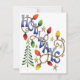 Facile à customiser Invitation de fête de Noël avec le mot Fêtes dans les lumières de Noël. Des ornements rétro et des sucres de canne mettent l'accent sur l'arrière de l'invitation. Illustration vintage dessin Joyeux Noël design avec le mot "Vacances" enveloppé de lumières de Noël colorées jaune, rouge et vert. Entouré d'étoiles dorées et d'un sapin de Noël de la forêt.