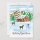 Une carte d'invitation "Holiday Open House" décorée d'un petit cabine rouge dans les bois nichés contre une chaîne de montagnes et tout est gelé avec de la neige avec des cerfs dans la cour avant curieux au sujet du bonhomme de neige illustré d'aquarelle. Vous pouvez modifier le texte en fonction de vos besoins.