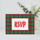 Un confortable motif de vacances rouge et vert plaid sur un modèle d'invitation RSVP personnalisé avec script et lettres enneigées. Customisez-le pour modifier les polices, le dimensionnement, même enregistrer votre conception pour plus tard.