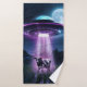 Scène mystérieuse d'un OVNI soulevant une vache dans un rayon de lumière sur fond de ciel nocturne avec une pleine lune. Illustration parfaite pour les fans de science-fiction, et histoires fantastiques sur le contact avec des civilisations extraterrestres.
