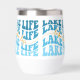 Ce caisson en verre de vin est parfait pour un cabine de lac ou un passionné de bateau. Le texte bleu "LAKE LIFE" est répété dans différentes nuances de bleu, avec l'écriture orange au centre qui dit aussi "lake life". Le motif est répété autour du périmètre du tumeur et est placé sur un arrière - plan blanc.