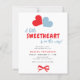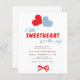 Valentine's boy baby shower invitation with A little sweetheart is on the way typography script featuring two hearts and a red bow.