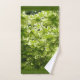 This towel set keeps you in sync with the season. It features a beautiful variegated maple leaves canopy as seen from underneath during the height of Summer. This pattern makes a great accent on the wash cloth, hand towel and bath towel. Customize with text if you prefer not to have just the green edge.