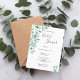 Une invitation branchée à la douche nuptiale en blanc et vert. Un arrière - plan blanc chic à l'avant. Décoré de sprigs botaniques verts et de verdure, feuillage. Un grand script à main moderne, typographie avec le texte : Fête des mariées. Modèles pour que la mariée soit le nom et les détails du parti. Texte gris foncé. Retour : arrière - plan vert. Conseil : Si vous ne voulez pas qu'il ressemble à une carte postale, cliquez sur customiser, allez à l'arrière et retirez le séparateur et le timbre postal.