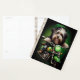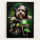 Un ami en fureur derrière les guidons d'une moto verte brillante, portant une tenue verte de la Saint Patrick qui fait tourner la tête. Le chien est habillé d'un ensemble festif, avec une cravate arc-en-ciel verte et un chapeau haut assorti qui se trouve doucement au-dessus de la tête. Le costume présente des motifs complexes de shamrocks et de leprechauns, ce qui indique clairement que ce chien est prêt à célébrer la Saint Patrick avec style.