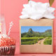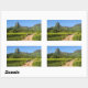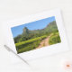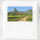 Autocollant photo rectangulaire avec une touriste à vélo sur un chemin de terre avec la montagne Rotui dans l'arrière - plan sur l'île tropicale de Moorea, près de Tahiti, en Polynésie française.