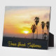 Cette photo montre un beau coucher de soleil doré jaune, orange, rouge et violet sur l'océan Pacifique à Venice Beach en Californie. La scène est ornée de silhouettes de gens qui se promènent le long de la fameuse promenade de bord de mer, près des palmiers qui s'élèvent le long du littoral de sable et de mer.