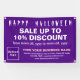 Horreur, effrayant, effrayant, terrifiant, fantôme, monstre, crâne, citrouille et ainsi de suite. Joyeux Halloween ! Vacances pour faire peur, mais pas pour effrayer les clients. Vacances à célébrer en octobre et pour faire également la publicité de votre entreprise. Bannière rectangulaire personnalisable avec Halloween Sale, le nom de votre entreprise et d'autres informations. Bannière que vous pouvez utiliser comme matériel marketing pour attirer plus de clients. Personnalisez-la et affichez-la pour convaincre davantage de clients d'acheter vos produits ou de faire appel à vos services. Les couleurs de conception sont des textes roses et blancs sur fond violet. Le contenu comprend un message de Joyeux Halloween, des textes de soldes avec des pourcentages de réduction que vous offrirez, les dates de solde, le nom de votre entreprise, logo, adresse, numéro de téléphone, e-mail et site web ou page de médias sociaux de votre entreprise. Veuillez vérifier l'apparence après avoir téléchargé le logo et saisi les textes. Si l'apparence vous plaît, vous pouvez passer votre commande maintenant. Si vous devez redimensionner et déplacer le logo et les textes pour les adapter à cette bannière ou à la taille que vous choisirez, veuillez modifier dans l'outil de conception