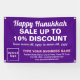 Joyeux Hanukkah ! Nous vous souhaitons joie, paix et bénédiction pour cette fête des lumières. Période de fêtes à célébrer en décembre et également de promotion pour votre entreprise. Bannière rectangulaire personnalisable avec "Hanukkah Sale", votre nom d'entreprise et d'autres informations. Bannière que vous pouvez utiliser comme matériel marketing pour attirer davantage de clients. Personnalisez-la et affichez-la pour convaincre davantage de clients d'acheter vos produits ou de faire appel à vos services. Les couleurs du design sont des textes rose et blanc sur fond violet. Le contenu comprend un message de Joyeux Hanukkah, des textes de soldes avec pourcentage de réduction que vous offrirez, dates de solde, nom de votre entreprise, logo, adresse, numéro de téléphone, e-mail et site web ou page de réseaux sociaux de votre entreprise. Veuillez vérifier l'apparence après avoir téléchargé le logo et saisi les textes. Si l'apparence vous convient, vous pouvez passer votre commande maintenant. Si vous devez redimensionner et déplacer le logo et les textes pour les adapter à cette bannière ou à la taille que vous choisirez, veuillez modifier dans l'outil de conception. Vous pouvez également modifier la couleur de fond