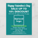Bonne Saint Valentin ! Un beau jour férié pour célébrer ce mois de février et faire de la publicité pour votre entreprise ou pour promouvoir votre marque. Circulaire personnalisable avec vente Valentine, votre nom d'entreprise et d'autres informations de votre entreprise, un matériel marketing que vous pouvez utiliser pour attirer plus de clients. Customisez-le et distribuez-le afin d'attirer plus de clients pour acheter vos produits ou clients pour aimer vos services. Les couleurs design sont des textes blancs et jaunes-verts sur arrière - plan vert turquoise. Pour customiser ce prospectus, indiquez le pourcentage de remise que vous proposerez et les dates de vente. Téléchargez également votre logo d'entreprise, tapez votre nom d'entreprise, votre adresse, votre numéro de téléphone, votre adresse électronique et votre site Web ou votre page de médias sociaux d'affaires. Veuillez vérifier l'apparence sur les côtés avant et arrière après avoir tapé des textes et chargé le logo. Si l'apparence vous plaît, vous pouvez passer votre commande maintenant. Si vous avez besoin de redimensionner et déplacer les textes et le logo pour s'adapter à ce flyer ou à la taille que vous choisirez, veuillez modifier l'outil de conception. Vous pouvez également modifier la couleur arrière - plan, la couleur de police et le style de police dans l'outil de conception. Bonne Saint Valentin ! Je vous souhaite plus de ventes ce jour férié.