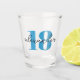 Verre à shot personnalisé pour 18 ans avec texte d'âge bleu et nom en écriture moderne. Les couleurs et les polices peuvent être modifiées si nécessaire.
