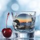 Un huard sur le lac au coucher du soleil et des cattails en toile de fond de bleu