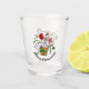 A funny snowman cartoon on a shot glass for Christmas. Use "Personalize this template" to change the "Merry Christmas!" text and create a unique, customized item. It's maximum Christmas with this excited snowman dressed up as Santa Claus, jumping out of a Christmas present like a jack-in-the-box. The happy snowman is bursting out of a gift box wrapped in gold paisley wrapping paper and a green ribbon with white snowflakes.