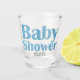 Cette vitre amusante, à base de silice, contient l'expression "Baby shower" imprimée dans un style rétro, fausse police de parties scintillant bleu bébé. Le mot "shots" est imprimé ci-dessous dans une police noire.