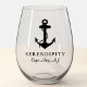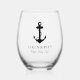 Un verre à vin sur le thème nautique pour votre bateau avec une illustration noire classique d'une ancre et d'une corde, ainsi que le nom et l'emplacement de votre bateau en écriture et typographie élégantes.