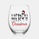 Répandez les fêtes avec ce mignon verre de vin qui contient les mots "Joyeux Noël" dans un plat de buffle noir et blanc associé à un script rouge. Un chèque de bison rouge et noir Santa Hat est niché au sommet. Faites un grand cadeau, un garde-manger ou juste un ajout amusant à votre décor de vacances.