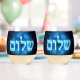 Lumineuse lecture de texte hébraïque bleu et blanc, "Shalom" (ש ל ו - paix) superposée sur une élégante image fractale, bleue, à l'aspect gravé d'une Étoile de David. Customisez en ajoutant votre propre texte à l'envers.