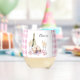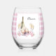 Verre à vin mignon, personnalisé avec votre nom en lettres manuscrites sucrées. Le design présente une bande de en vichy rose et blanc avec une aquarelle illustrant une bouteille de champagne ou de vin mousseux, des verres, des cupcakes et des fleurs roses. Veuillez naviguer dans ma collection de Fêtes des mariées Cupcakes et Cava pour coordonner des jeux et des signes ou m'envoyer un message si vous avez besoin d'autres articles ajoutés.