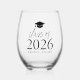 Verre moderne de graduation avec une casquette de graduation près du haut du design avec "Class of 2025" affiché dans un script noir et une police serif. Personnalisez le verre à vin personnalisé avec le nom du diplômé. Ce verre de vin personnalisé et sans tige est le cadeau parfait pour les diplômés spéciaux de votre vie et rend une excellente fête de remise de diplômes !