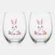 Hop into spring with these irresistibly adorable Easter Bunny Stemless Wine Glasses. Each glass features a sweet white bunny with big pink ears, rosy cheeks, and a happy smile, sitting among a rainbow of colorful Easter eggs on a bright green grass patch.