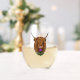 Portrait d'une vache hauturière aux cheveux auburn. Un chardon écossais avec noeud celtique vert est en face de la vache.