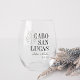 Impressionnez vos invités de mariage de destination avec ces faveurs de mariage chic et moderne en verre de vin personnalisé sans tige. Design présente une illustration en feuille de monstère vert foncé avec votre destination mariage alignée à droite (avec Cabo San Lucas) en lettres serif classiques. Ajoutez vos noms sous le script cursif manuscrit, ainsi que l'année. La position de la feuille peut être ajustée et les couleurs peuvent être modifiées pour correspondre aux couleurs de votre mariage à l'aide de l'outil de conception de Zazzle.