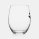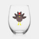 Ce magnifique verre à vin sans tige présente un dessin amusant d'une dinde de Noël aux grands yeux noirs, un petit bec jaune et des plumes de queue qui s'accrochent. Les pieds sont orientés dans des directions opposées, ce qui rend la dinde maladroite. La dinde porte un chapeau de Père Noël rouge et blanc et est prête pour Noël.