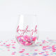 Lancez la fête avec ces magnifiques verres à vin sans pied personnalisés qui sont parfaits pour les enterrements de vie de jeune fille, les demoiselles d'honneur ou toute autre occasion ! Le design comporte un nom dans une typographie cursive manuscrite rose mignonne.