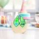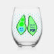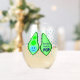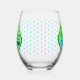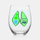Ce magnifique verre de vin sans tige présente une image graphique d'un pod vert de pois contenant 2 pois verts et un gros pois bleu. Le grand pois bleu a un petit visage mignon avec les yeux et une bouche. De l'autre côté du pod en rose foncé, il est écrit "Baby Boy Ready to Pop". Le design est idéal pour un faire-part de grossesse ou un baby shower. Il y a un groupe de petits pois bleus dans l'arrière - plan.