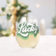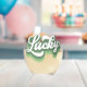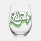 Ce verre de vin sans tige amusant présente un script rétro qui dit "Lucky" dans une police verte et blanche en détresse. Parfait pour célébrer la Saint Patrick !
