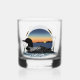 Un huard sur un lac au coucher du soleil et des cailloux sur fond de bleu
