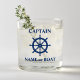 Un verre de whisky à thème nautique personnalisé avec "Capitaine" (ou autre titre) et votre nom de bateau, de yacht ou de famille. Ce design comprend une roue à gouvernail créée sur mesure ainsi qu'une typographie stylisée en bleu marine.