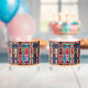 Verres aux couleurs vives avec des motifs géométriques rouges et bleus.