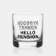 Goodbye Tension Bonjour Pension drôle cadeau de retraite Whiskey Glass. Cool typographie design pour le père, mari, grand-père, oncle, coach, ami, patron, enseignant, frère, collègue, collègue, etc. Personnalisez avec votre nom et vos couleurs. Conception humoristique de bureau. Imprimez sur deux côtés.