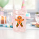 Ce magnifique verre peut présenter un joli dessin d'un homme en pain d'épices coloré. Il a des boutons rouges et verts, un grand sourire sur le visage et des tasselles rouges et vertes autour des jambes prêtes pour une fête de Noël. Il y a du texte personnalisé pour que vous puissiez inclure un nom ou un message. Le message par défaut indique Joyeuses Fêtes.