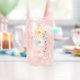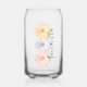 Nom personnalisé fleur marguerite tendance peut verre. Le design présente trois marguerites en rose pastel, gris et jaune.