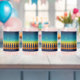 Inspirée par les magnifiques ciels de coucher de soleil et les pins Ponderosa d'Arizona, cette œuvre d'art originale présente un ciel de coucher de soleil orange, jaune et bleu lumineux derrière des arbres ponderosa géométriques avec des étoiles et un croissant de lune.
