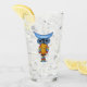 Ce caisson en verre pour les boissons a un hibou bleu et jaune fantaisie avec de grands yeux en cercle bleu et des plumes colorées et une queue en jaune, bleu et rouge sur le devant et le dos.