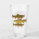 Un proverbe humoristique : "La meilleure façon de réduire un poisson est avec une règle, le meilleur moyen de faire pousser un poisson est avec une bière." et de l'autre côté du verre sont les 3 espèces de truites les plus communes - brun, brook et arc-en-ciel. Des aquarelles originales de Thom Glace