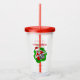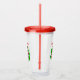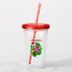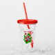 Cette rondelle acrylique avec paille et couvercle a un squelette amusant qui regarde d'une forme rouge et verte brillante dimensionnelle portant un chapeau de Père Noël tenant des ornements de Noël à ses yeux. Customisez le texte Joyeux Noël avec le modèle à l'avant et à l'arrière.