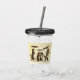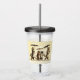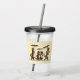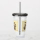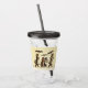 Cette boisson acrylique tumbler avec paille et couvercle a deux chats bruns marchant avec deux chatons tous tenant des parapluies dans la neige tombante sur un arrière - plan jaune.