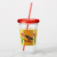 Cette rondelle acrylique avec paille et couvercle a une corneille noire debout sur une branche d'arbre avec une fleur rouge abstraite avec centre jaune de chaque côté sur un arrière - plan jaune.