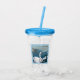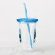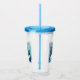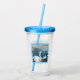 Cette rondelle acrylique avec paille et couvercle a une jolie cygne mère blanche nageant dans un lac bleu entouré d'arbres avec son bébé dans une bordure bleu clair ornée à l'avant et à l'arrière.