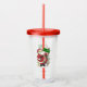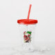 Cette rondelle acrylique avec paille et couvercle a un Père Noël mignon debout dans la neige entourée de petits animaux de forêt et d'oiseaux par un petit arbre décoré tenant un panneau vert Joyeux Noël à l'avant et à l'arrière.